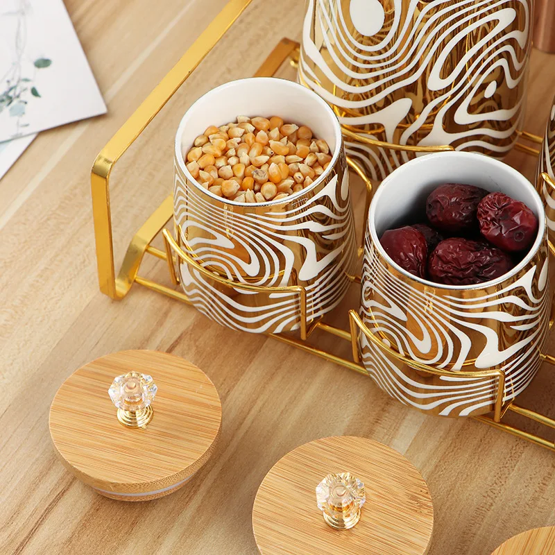 Gold-plated Marbling Sealed Ceramic Storage Jar With Bamboo Lid Spices Tank Container Kitchen Food Bottle Coffee Tea Caddy